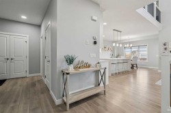 Welcome to this beautifully designed two-storey home in the desirable community of Cobblestone Creek—where style, function, and thoughtful design come together.Step inside to an inviting OPEN-CONCEPT main floor featuring a chef-inspired kitchen that is a showstopper with WATERFALL QUARTZ COUNTERTOPS on the ISLAND with a BREAKFAST BAR, an INDUCTION RANGE, sleek hood fan, BUILT-IN MICROWAVE, and a WALK-THROUGH PANTRY connecting seamlessly to the mudroom. The mudroom offers a BUILT-IN BENCH and convenient access to the TRIPLE ATTACHED GARAGE, complete with an EV CHARGER, SIDE ENTRANCE, and a handy BIN STORAGE SYSTEM. The living room impresses with soaring OPEN-TO-BELOW CEILINGS, an OPEN RAILING, and an ELECTRIC FIREPLACE with a MANTLE, creating a stunning focal point for family gatherings. A dedicated OFFICE on the main floor, is perfect for remote work or homework space. Upstairs, you’ll find a bright BONUS ROOM accented with BOARD and BATTEN detailing, along with two spacious kids’ bedrooms featuring the same custom touch. All bathrooms showcase QUARTZ COUNTERTOPS, adding a touch of luxury throughout. The laundry room is conveniently located upstairs.The primary bedroom is a serene retreat with a 5-piece ENSUITE featuring DOUBLE SINKS, a SOAKING TUB and a STAND ALONE SHOWER. The WALK-IN CLOSET that offers TWO-TIERED SHELVING and a WINDOW for natural light—a rare and thoughtful upgrade.The UNFINISHED BASEMENT includes a BATHROOM ROUGH-IN, ready for your future development. Outside, enjoy the TWO-TIER COMPOSITE DECK, PARTIALLY COVERED for all-weather entertaining, overlooking TWO-TIERED LANDSCAPING with ARTIFICIAL TURF and a PAVED PATHWAY and GREEN SPACE behind—offering privacy and easy outdoor living.This home blends modern comfort, designer details, and practical upgrades in one of Airdrie’s fastest-growing communities.
