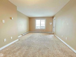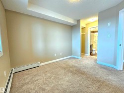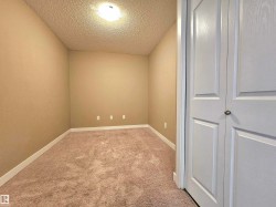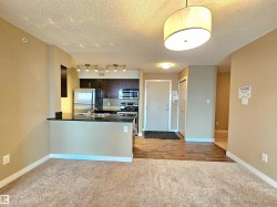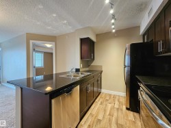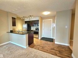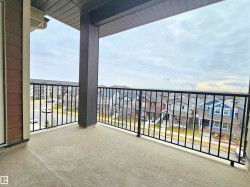 Beautiful and spacious move-in ready with IMMEDIATE POSSESSION 847 sq. ft. 2 bedrooms plus DEN, 2 baths, and 2 titled parking stalls (one underground and one surface parking) top floor condo unit in Elements At McConachie. This lovely unit has contemporary color tones newly painted 5 years ago. Large and bright living room has big window and access to the Southeast facing balcony. Beautiful kitchen has granite countertops, extended breakfast bar, tiled backsplash, stainless steel appliances, and laminate flooring. Spacious dining area. Good size bedrooms. Primary bedroom has walk-through closet and 3 pcs. ensuite. The second bedroom has adjacent 4 pcs. main bath. A good size den offers much versatility. Convenient insuite laundry with newer washer. Two titled parking stalls. The underground parking stall is conveniently located just steps to the elevator. Close to all amenities and quick access to Anthony Henday.
