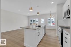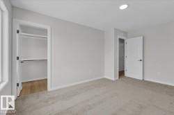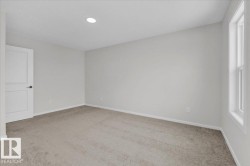 IMMEDIATE POSSESSION. This newly built 2-storey half duplex by Alquinn Homes offers exceptional value backing greenspace and a deck already included. The main floor showcases a contemporary open-concept design that seamlessly connects the kitchen, dining, and living areas—ideal for both everyday living and entertaining. The modern kitchen is thoughtfully appointed with a central island, breakfast bar, walk-in pantry, and refined finishes throughout. A practical rear mudroom adds convenience with a built-in bench and cubbies. Upstairs, enjoy the flexibility of a bonus room alongside upper-floor laundry, 2 additional bedrooms, and a full bathroom. The primary suite is a private retreat, featuring a spacious walk-in closet and a beautifully finished 5pc ensuite with elegant fixtures. UPGRADES: deck, fully fenced yard, upgraded appliances, triple-pane windows, upgraded flooring, MDF shelving throughout, double closet doors, soft-close cabinetry, sill granite sinks, and more. *Photos are representative*