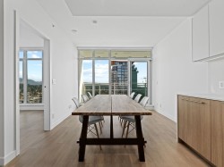 Exceptional 17th-Floor 1-Bedroom at “WEST” by Beedie. Enjoy 180-degree beautiful mountain, city, and ocean views from inside this brand-new concrete condo. Thoughtful design meets modern luxury with 9’ ceilings, custom millwork and an efficient floor plan that includes a generous bedroom plus versatile laundry/flex room. Chef-inspired kitchen showcases integrated Fisher & Paykel appliances — including gas cooktop — while air conditioning with smart thermostat keeps you comfortable year-round. Enjoy best-in-class amenities: state-of-the-art fitness centre, co-working lounge, oversized outdoor terrace, sports court and private guest suite. Outstanding location in Austin Heights connected to new Safeway and steps to cafés, shops and transit. 1 parking and 1 locker. This is it!