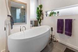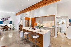 This stunning residence exemplifies design and construction where exacting standards were not just met, but exceeded. Thoughtful planning is apparent in every corner, creating a light-filled home with a comfortable layout and an incredibly efficient use of space. The home incorporates cutting-edge passive solar design, featuring large south-facing windows to maximize winter solar gain and strategic overhangs for summer cooling. A two-story concrete wall acts as a thermal mass, regulating interior temperatures, complemented by luxurious hydronic radiant heating beneath the polished concrete floors. Built with quality second to none, this home is truly designed to last. Adding to the value and flexibility is a semi-lofted legal suite, conveniently situated at the side of the house
