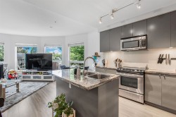 Welcome to Waterstone – premier resort-inspired community on the border of Surrey/Langley. This spacious 2 bedroom, 2 bathroom CORNER UNIT offers designer living with a gourmet kitchen featuring granite countertops, lots of natural light, and rich laminate flooring. The open layout is highlighted by soaring 9’ ceilings, oversized windows, upgraded in-suite laundry, and a private sunny balcony perfect for relaxing or entertaining. Added value includes 2 underground parking stalls and 2 large storage lockers. Waterstone is known for its 15,000 sq. ft. Clubhouse & Wellness Centre—offering a fireside lounge with demo kitchen & wine bar, private 17-seat movie theatre, billiards room, state-of-the-art fitness facilities, yoga studio, indoor lap pool, sauna, and hot tub. Don't miss this one!