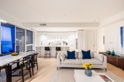 Welcome to Foster Martin in the heart of White Rock! This 2 bed, 2.5 bath ocean-facing residence offers sweeping views of Semiahmoo Bay from every principal room. Thoughtfully designed with floor-to-ceiling windows, A/C, and wide-plank flooring throughout. The chef's kitchen features a full Miele appliance package with steam oven, large island, and elegant marble finishes. Enjoy seamless indoor-outdoor living with a spacious balcony perfect for relaxing or entertaining. The primary bedroom includes a spa-like ensuite with double vanity and walk-in shower. World-class amenities include a concierge, indoor/outdoor pool, hot tub, sauna, gym, and residents' lounge. Steps to the beach, promenade, restaurants, and shops. Includes 2 parking stalls (1 EV) and 1 locker. Concrete construction.