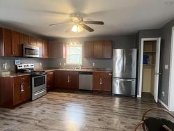 This cozy home Nestled in a serene park-like setting on a large 15,000 square foot lot, this 1100 square foot charming story and half offers a tranquil atmosphere perfect for relaxation. The property offers two upstairs bedrooms, an upstairs full bathroom featuring a deep soaker tub and shower unit, and a downstairs half bath/laundry room equipped with oversized laundry appliances with a nice size storage closet. The bright living room, with elegant light fixtures, flows seamlessly into the a spacious eat-in kitchen which is complete with four stainless steel appliances and an abundance of warm walnut upper and lower kitchen cabinets. Ample counter top space allows for convenient meal preparation. As you enter the kitchen from the side door, a large walk in closet provides a spacious place to keep outdoor jackets and footwear organized and stowed out of site when not in use. The kitchen also has a 9 foot built in food pantry with shelves adjacent to the refrigerator. The outdoor electric hot water tank and oil furnace as well as the 8 x 10 storage shed provide additional storage. The home is kept warm and cozy with a heat pump and oil baseboard for back up. The heat pump also provides refreshing air conditioning during the hot summer months. The private deck off the kitchen offers a peaceful setting for morning coffee or evening barbecues. The large town lot is a natural beauty, complete with diverse tree species, birdlife, and wildlife, which creates a serene atmosphere. The deck extends into a secure chain-linked area, ideal for small children and pets. This cozy home is efficiently heated by a heat pump, with oil serving as a backup heating source. The property utilizes the town of New Glasgow's municipal services.
