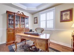 Fantastic 4 bedroom home featuring over 3100 square feet nestled on a 69 by 117 foot pie shaped lot and located in the exclusive area of Joshua Creek. Spacious living/dining room area with hardwood floors and coffered ceiling. Large family size kitchen with granite countertops, stainless steel appliances with Jennair gas stove, breakfast bar, pot lighting, ceramic floors, and stone backsplash. Gorgeous family room with hardwood floors, gas fireplace with custom cabinetry and mantle. Fantastic layout with 9 foot ceilings on the main level, freshly painted throughout (2024), convenient main floor office with coffered ceilings, 2 piece powder room with pedestal sink, main floor laundry with front load washer/dryer, California shutters and crown moulding on the main and upper levels. Primary bedroom retreat his/her walk-in closets, 5 piece en-suite with oval tub and walk-in shower with rain shower head. Upper level sitting area, updated main 4 piece bathroom with porcelain floors and soaker tub. Great curb appeal with double door entry with beveled glass, stone/brick exterior, stone driveway, walkway and front patio area. Backyard oasis with walk-out to custom composite decking with glass panels (2024), flagstone walkway leading from side yard, gorgeous landscaped gardens, and garden shed. Premium location close to schools, parks, trails, golf, transit, and highways. Fridge (2024), stove, dishwasher (2024), washer, dryer, central vacuum with attachments (not carpet), 2 garage door openers, garden shed, all light fixtures, and all window coverings.