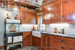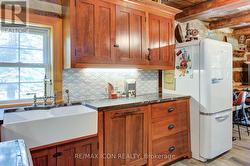 Discover the charm of this stunning century-old log cabin, beautifully set on a peaceful creekside lot. Thoughtfully renovated to blend rustic character with modern comfort, this one-of-a-kind retreat offers a warm and inviting lifestyle. The heart of the home features a custom cherry kitchen with leathered granite countertops, a live-edge wood counter in the butlers pantry, and premium Bosch appliances (2023). Heated floors in the kitchen prep area and bathroom provide everyday luxury, while the propane fireplace (serviced May 2024) creates cozy ambiance year-round. A versatile bunkie/guest house/home office, complete with its own electric fireplace and keyless entry, expands your living or work-from-home options. Step outside to enjoy the custom timber-frame pavilion with industrial-grade heat, retractable screens, and LED lighting - perfect for entertaining or relaxing by the creek. Practical upgrades include a new water heater, pump, and water softener (2022), with the septic pumped in June 2023. The professionally landscaped 0.37-acre property features a retractable awning, dusk-to-dawn driveway lighting, and propane BBQ hook-up. With 103 ft of frontage and serene creek views, this remarkable property offers the perfect balance of character, comfort, and natural beauty. A truly rare opportunity to make a log cabin retreat your year-round home. (id:27)
