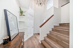 This beautifully updated home is tucked away on a quiet street and backs directly onto green space, giving you privacy, open views, and no homes behind you. With 2,221.8 sqft of total developed living space, this property perfectly balances comfort, style, and functionality for family living. Step inside to a bright, vaulted foyer that opens into a spacious, open-concept main floor. In 2025, the home received a full interior refresh, including complete interior paint, new flooring, new baseboards, new light fixtures throughout the house, ,Deck and Fence Stained & repainted, and an upgraded 8-camera security system for added peace of mind. The exterior has been meticulously maintained with new siding on the west and back sides, new downspouts, shingles (2016), and a new hot water tank (2020). The large kitchen boasts a massive island, ideal for meal prep, entertaining, and family gatherings. The dining nook overlooks the oversized, landscaped backyard and the peaceful green space beyond, creating a scenic and functional space for everyday living. The living room features a cozy fireplace, and the main floor also offers a convenient 2-piece powder room and laundry area. Upstairs, a spacious bonus room provides a perfect second living space, while the primary bedroom includes a walk-in closet and ensuite. Two additional bedrooms share a 4-piece full bathroom, offering plenty of room for family or guests. The fully finished basement adds flexibility for a rec room, home gym, entertainment area, or hosting plus, the Murphy bed is included with the sale.