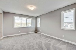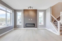 Please enjoy a virtual tour of this immaculate and beautifully designed home, ideally situated in one of Cochrane’s most convenient and sought-after neighbourhoods! Located on a large corner lot directly across from central Reindeer Park, this spacious 3-bedroom, 2.5-bath home offers over 2,000 sq ft of stylish and comfortable living space—perfect for larger or upscaling families. From the moment you step through the grand 8' front door, you'll be greeted by soaring 9' ceilings, oversized windows, and gleaming hardwood floors that flow throughout the foyer, hallway, great room, kitchen, and nook—creating a warm and elegant atmosphere. The open floor plan enhances the sense of space and flow, ideal for both everyday living and entertaining. The stunning kitchen features dual-colour quartz countertops and cabinetry, a tiled walk-through pantry connecting to the mudroom, stainless steel appliances including a self-cleaning gas range, a built-in microwave, and a dishwasher. A spacious great room anchored by a sleek Napoleon Alluravision fireplace adds a cozy yet modern touch. Upstairs, the generous master bedroom includes a luxurious 5-piece ensuite with dual quartz vanities, undermounted sinks, a deep soaker tub beneath a bright window, and an oversized tiled shower. A large, separate walk-in closet provides ample space. The upper floor also boasts a forward-facing bonus room with a dramatic two-sided vaulted ceiling, two additional good-sized bedrooms with double-door closets, a main bath with quartz countertops, and a bright upper-floor laundry room with linen storage and tiled flooring. This home sits on a quiet street in a family-friendly area, less than 5 minutes from elementary, junior high, and high schools, and under 8 minutes to grocery stores, parks, coffee shops, and restaurants. With easy access to downtown Calgary (just 40 minutes away) and the Tuscany LRT station (only 25 minutes away), convenience is at your doorstep. Beautiful, elegant, and functional—this home has it all. Book your private showing today!