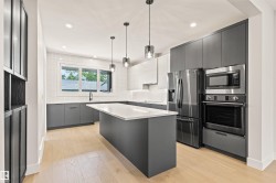 Walk to the University, the hospitals and the Jubilee, Hook up to the trails of the river valley, Hawrelak Park and the Mayfair GCC, and zip to your downtown office in only minutes from this beautifully constructed Lozen Developments 2355 square foot 2.5 storey half duplex. Facing the river valley, features of this spacious 4 bedroom home include a 3rd storey loft with a wet bar, vaulted ceilings and access to a large west facing deck, a Spacious open main floor with 9’ ceilings, contemporary engineered hardwood, a gourmet kitchen with black SS appliances, Quartz counters and cabinetry by Cucina Bella, the Living and dining rooms with an electric fireplace and built in desks, a 2nd level with the laundry, a 4-piece bath and 3 bedrooms, the master with a large 5-piece ensuite, and a Fully developed basement with a separate entrance, and a Fully landscaped and fenced yard with a covered deck and double detached garage. With immediate possession and this location it’s a must to view!