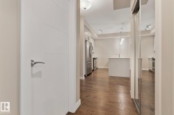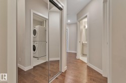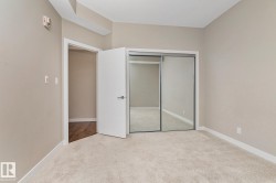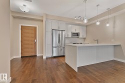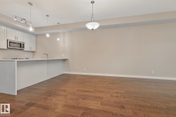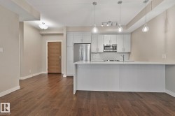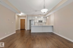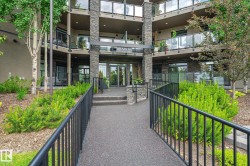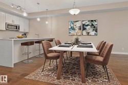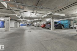 Welcome to The Leger / Brass III – a stylish top-floor condo offering 1,206 sq.ft. of open living space with soaring 9’ ceilings and an abundance of natural light. This beautifully designed home features a modern kitchen with quartz counters and island seating, flowing seamlessly into the spacious dining and living areas. Step onto your balcony to enjoy sunshine and park views. The primary suite impresses with a large walk-in closet and a spa-inspired ensuite with soaker tub and glass shower. A second bedroom and full bath provide versatility for guests or a home office. In-suite laundry, Hunter Douglas Blinds, Central Air Conditioning, heated underground parking, and a storage cage add everyday convenience. This well-managed building includes visitor parking, security, and a welcoming community feel. Located just steps from the Terwillegar Rec Centre, schools, shopping, and major transit. Pet-friendly with board approval. A perfect blend of comfort and convenience in the heart of Leger!