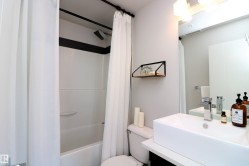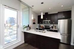Come home to the 8th floor of the prestigious Ultima Tower! This contemporary 2-bed 2-bath corner suite offers sweeping views of downtown. Located in Ice District just steps away from Rogers Place. Open floor plan with loads of natural light from south and east facing floor to ceiling windows. 9’ ceilings, neutral paint palette and luxury vinyl plank blanket the floor. The spacious kitchen has been carefully crafted with granite countertops, stainless steel appliance package and dark maple cabinets. Work from home, tan on the south facing deck, this condo is fantastic! With 2 spacious bedrooms, including the primary bedroom that boasts a large walk-in closet and private ensuite bath. The building has an amazing lifestyle amenities package that includes gym, hot tub, huge patio, bbq area, indoor kitchen space and sitting area. All of this, plus titled underground heated parking, all located within walking distance to Rogers Place, MacEwan University, Jasper Avenue, and so many eateries!