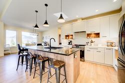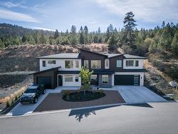 This custom-designed, one-of-a-kind home built by Fidanza is ideally situated at the end of a quiet cul-de-sac on Galore Crescent. Set on a spacious 8,567 sq.ft. lot, the property features a unique layout with a fully self-contained 1-bedroom legal suite—complete with its own private garage—located on the east side of the home, offering excellent flexibility and income potential. The main residence occupies the west side and boasts 3 spacious bedrooms upstairs plus a convenient office on the main entry level. The interior is tastefully finished with a mix of laminate, tile, and vinyl plank flooring, and the open-concept main living area features raised ceilings and sweeping valley views. The stylish kitchen is a true showpiece, with a large island ideal for entertaining and modern two-tone cabinetry that adds a designer touch. Enjoy privacy, a premium location, and the benefit of a mortgage helper—all in one exceptional home. All measurements are approximate and should be verified by the buyer.
