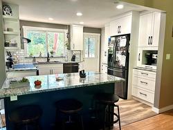 Welcome to your dream home! This beautifully renovated home is just waiting for a new family. The spectacular custom kitchen features an island, granite countertops, and the coolest coffee bar. Entertaining is easy as everything is open, you can still visit with your guests from the kitchen or dining room. The full bathrooms up and down are both beautifully renovated. The spacious primary bedroom features a two piece ensuite and a good size closet. There are two more bedrooms on the main as well as one downstairs along with a family room and an outside basement entry. That space could be fantastic for a potential suite. If you like the option of wood heat this home has a fireplace on the main and a wood stove in the basement. The outside features a two level deck with a hot tub. You will never want to go inside once you settle in the multiple spaces on the cedar deck! There is additional storage under the deck, a storage shed, and a woodshed. Now that the evenings are getting cooler, you can enjoy the fire pit looking out to the green space. This home has been lovingly looked after by a happy family. Take a look with your REALTOR. You will be happy you did! So much more to see and so many extras that could be included with your purchase.