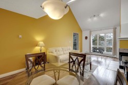 TOP FLOOR. Open-concept, vaulted ceiling, move-in-ready 758 sq.ft. 1 Bedroom at Carmel Point, built by Polygon in 1985. In-suite laundry and ample storage on the deck. Comes with one parking, one cat allowed, and dogs not allowed. Building was Rainscreened in 2015, including new windows, doors & balcony membrane. Over $200,000 in the reserve fund. Walking distance to Richmond Centre Mall, Minoru Pool/Recreation, Senior Centre & Transit.
