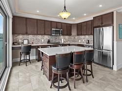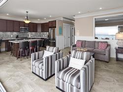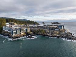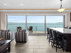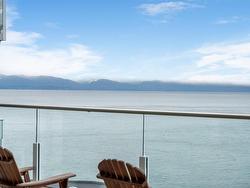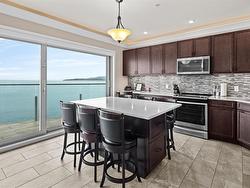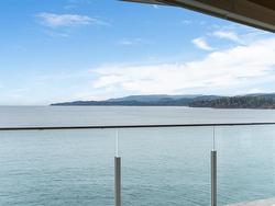 Experience the ease and elegance of oceanfront living in this exceptional two-bedroom, two-bath retreat. Perfectly positioned to capture panoramic views across the Salish Sea to the snow-dusted Olympic Mountains, every day features nature’s finest show. Thoughtfully designed to bring the outdoors in, the open-concept layout features a dramatic wall of floor-to-ceiling sliders that open to a prow-shaped deck—ideal for soaking in the ever-changing scenery. The chef-inspired kitchen is outfitted with quality stainless steel appliances, granite countertops, and custom cabinetry. The generous primary suite offers a spa-like ensuite complete with a freestanding soaker tub, separate shower, and heated floors. A second bedroom and full bath with stylish finishes and cozy heated floors ensure guests feel equally at home. Fully furnished and turn-key, this home offers effortless "lock & go" convenience and the option to rent when you're away—making it both a sanctuary and a smart investment.
