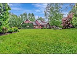 PRIVATE ESTATE LIVING – 22 Deerpath Court, an extraordinary residence tucked away on a quiet cul-de-sac, surrounded by towering trees and beautifully landscaped grounds. Situated on 1.17 private acres, resort-like property, this custom home offers over 5,018 sq ft of living space across 3 meticulously designed levels. The long, rounded driveway flows effortlessly toward an impressive 3-car garage & inviting covered front porch. Step inside the grand foyer, where a sweeping staircase, slate floors, and intricate trim work set the tone for timeless elegance. To your right, the formal living room offers rich herringbone hardwood floors & a statement fireplace—perfect for hosting guests or quiet evenings by the fire. The heart of the home is the magazine-worthy kitchen, featuring custom cabinetry, luxury appliances, stone counters, and a butcher block island. The bright breakfast area & family room are wrapped in windows with incredible views of the backyard retreat. Sunlight pours into the bonus sitting room—an ideal space to curl up with a coffee and take in the peaceful, natural surroundings. The main floor also offers a private office with fireplace, a spacious formal dining room, & a luxurious primary suite with double walk-in closets & spa-like ensuite overlooking the pool. Upstairs, you’ll find 3 generous bedrooms, 2 full bathrooms, & ample storage. The fully finished basement expands your living space with a rec room, bedroom, 3pc bathroom, and abundant storage, plus direct garage access—perfect for multi-generational living or future in-law potential. Step outside and discover your private oasis: an inground pool with slide, hot tub, lounging areas, and manicured gardens create the ultimate space for summer entertaining. This home truly combines luxury, privacy, and function in one of Cambridge’s most desirable enclaves, just minutes to shopping, trails, golf, & highway access. Welcome to your forever home on Deerpath Court—where every day feels like a getaway.
