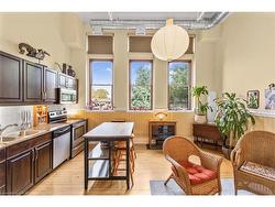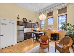 Welcome to the historic Stinson School Lofts, where heritage charm meets modern living. This bright and airy studio loft features soaring 13 foot ceilings, original hardwood floors, and oversized windows that flood the space with natural light. Designed for convenience and character, this open concept suite offers in unit laundry, all major appliances, and an assigned parking spot in the rear lot. Perfect for students, professionals, or down-sizers, this unique loft sits steps from the Bruce Trail, GO Station, and public transit with direct routes to McMaster University, Ancaster Meadowlands and Stoney Creek. Situated between three major hospitals and close to downtown, it’s an ideal spot for commuters or anyone seeking a walkable, connected lifestyle. Experience the charm of an 1800s schoolhouse reimagined into modern, boutique style living in one of Hamilton’s most iconic condo buildings.