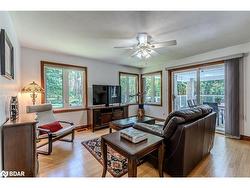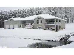 25 ACRE COUNTRY ESTATE WITH PRIVATE TRAILS, SUPERIOR CRAFTSMANSHIP, PREMIUM UPGRADES, & ENDLESS NATURAL BEAUTY! Welcome to an exceptional country estate set on 25 acres with mature forest, gardens, a tranquil pond, and a serene stream, creating a private retreat where year-round beauty and daily wildlife visits await. Offering 1 km of forest trails right on your property, this haven also places you minutes from golf, spas, provincial parks, skiing, snowmobile routes, boat launches, and beaches - with just 20 minutes to Orillia or 30 minutes to Barrie for added convenience. This home boasts over 4,500 sq ft of finished living space, custom-built with superior craftsmanship, energy efficiency, and pride of ownership throughout. Expansive outdoor living includes two porches, a sun-filled entertaining deck, a fire pit, and open-air gathering spaces, while the triple car garage with auto openers and an oversized driveway provides abundant parking and storage space. Inside, a wall of windows in the living room frames pond and garden views, flowing into a dining room and a bright family room with a porch walkout. A cozy den adds main floor versatility, while the gourmet kitchen impresses with a pantry, a built-in oven and countertop range, and a walkout to a sunny deck. A full 4-piece bath complements three bedrooms, including a luxurious primary suite with a walk-in closet and a 3-piece ensuite. The finished basement offers a bedroom, a den with a patio walkout, a large rec room with a wood stove, a workshop, home gym, and full bath, creating excellent in-law suite potential. An included hot tub and pool table add everyday leisure, while upgrades such as an owned water heater, water purification system, durable lifetime shingles, and enhanced attic insulation ensure lasting peace of mind. This is more than a #HomeToStay - it’s a rare retreat surrounded by natural beauty, offering unparalleled space, lifestyle and elegance ready to be treasured for years to come.